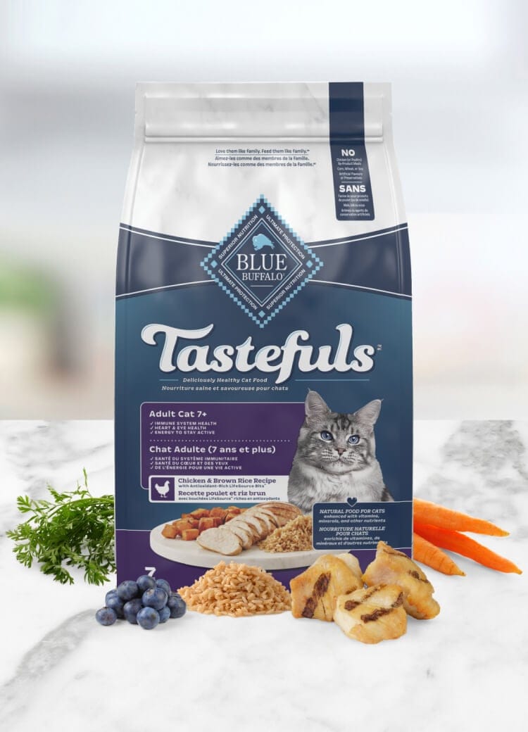 The BLUE Tastefuls™ Chicken and Brown Rice Recipe for Adult Cats 7+ is formulated to meet the nutritional levels established by the AAFCO Cat Food Nutrient Profiles for maintenance. The guaranteed analysis details the precise percentages of crude protein, crude fat, crude fiber, and moisture, alongside key vitamins and minerals such as DHA, Vitamin E, and taurine. It also lists the minimum percentages for Omega 3 and Omega 6 Fatty Acids, and essential additions like Ascorbic Acid (Vitamin C) and L-Carnitine, underscoring the comprehensive nutritional profile of this senior cat food.