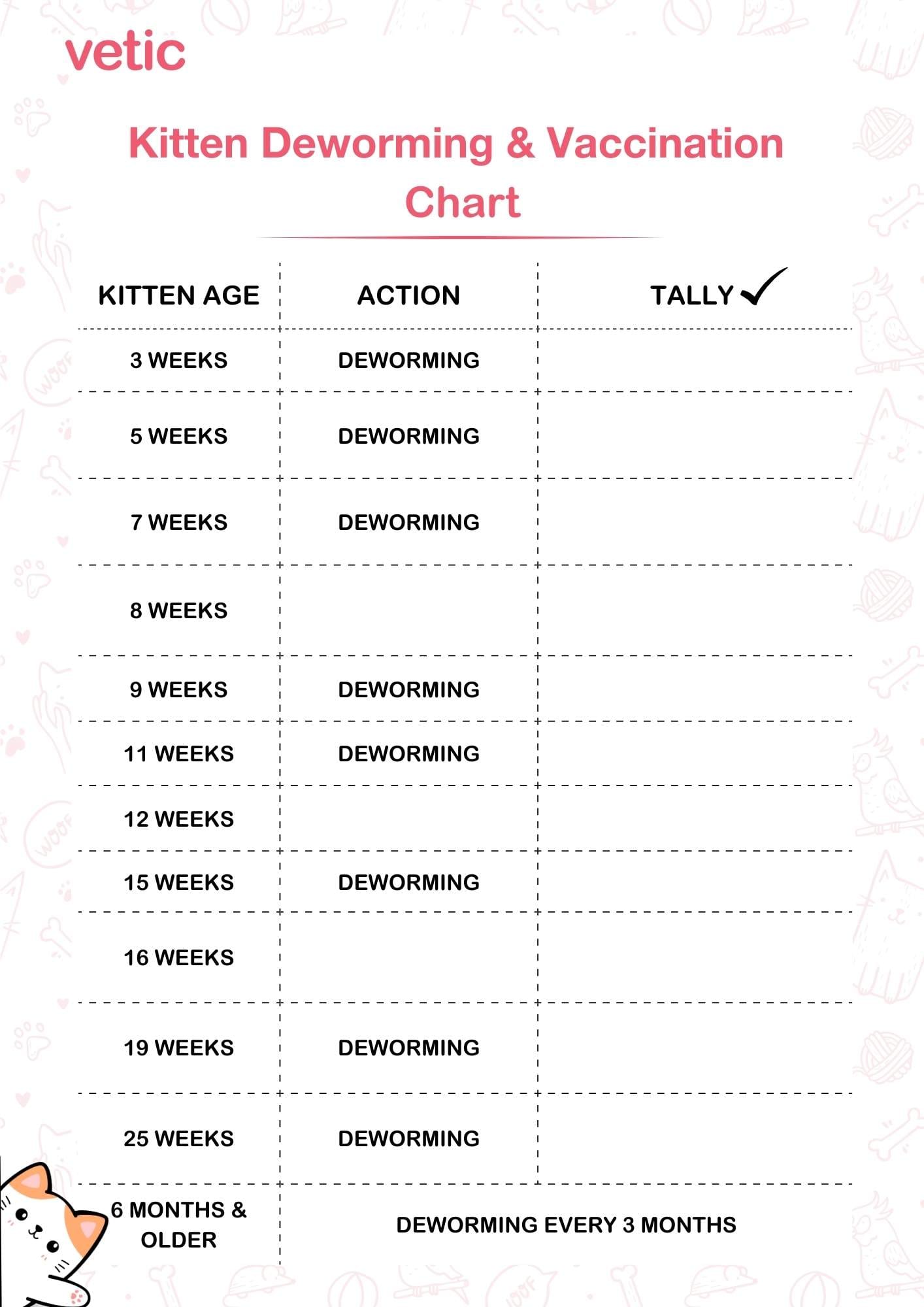 Kittens can begin deworming as early as 3 weeks of age with an appropriate product. Repeat treatments are advised every two weeks until they are 8 to 9 weeks old, followed by monthly treatments until they reach at least 6 months of age.