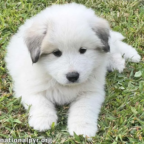 A Great Pyrenees puppy with a gentle expression.