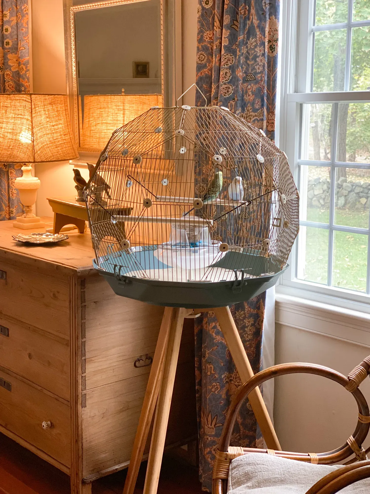 Nestled perfectly between a chair and a window, the Geo Bird Cage has become a stunning focal point in our living room, almost as if it were custom-made for the space. Bluey and Sunny seem to be thoroughly enjoying their new surroundings, immediately engaging in mutual preening, a clear sign of their comfort and contentment.